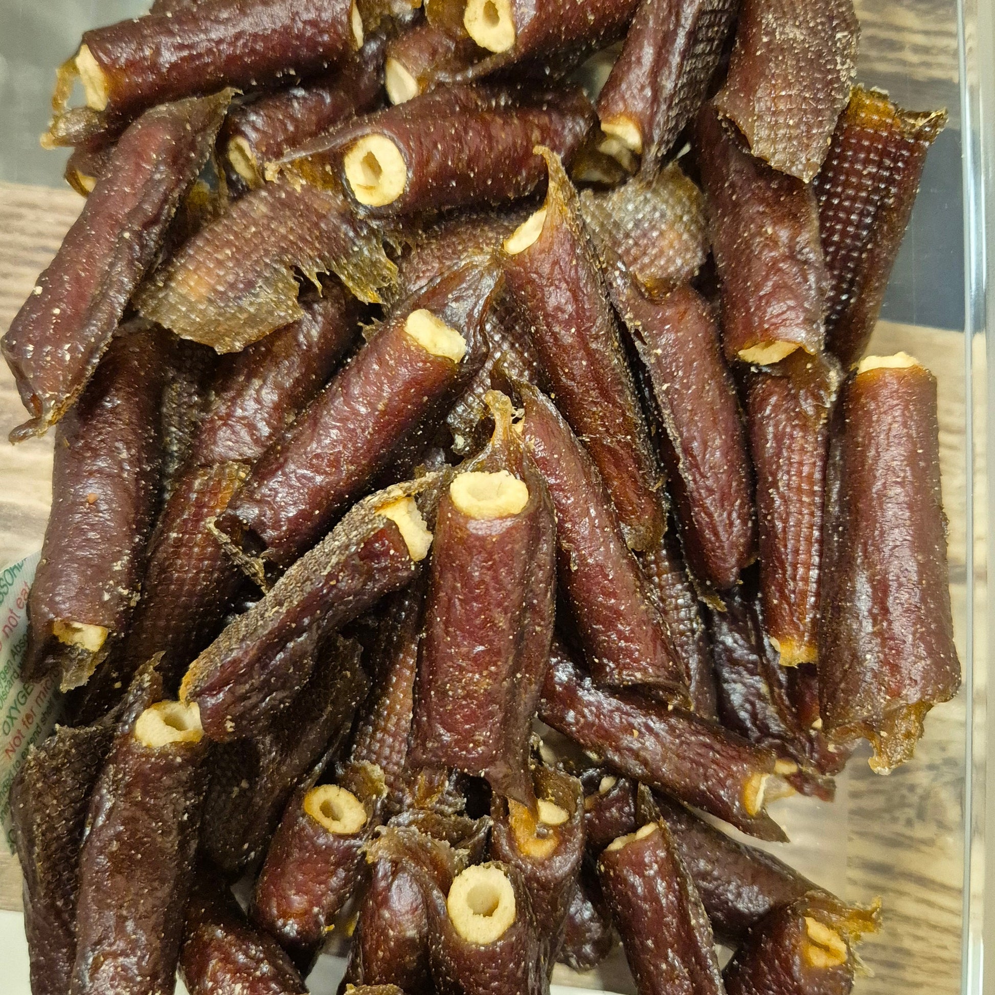 A Kacsás Rizscső szárított, valódi kacsa hússal készült, amelyet ropogós, rizses-kekszes csőre tekernek – így egyszerre finom és könnyen emészthető. Mesterséges ízfokozó és színezék nélkül készül, ezért allergiás és érzékeny emésztésű kutyáknak is biztonságos választás.